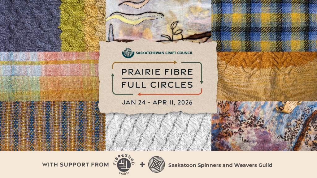 Prairie Fibre – Full Circles is a group exhibition by Saskatchewan fibre artists. The show was organized by Jude Haraldson through Prairie Fibreshed Inc., an organization that promotes circular textile processes within our province. All works in the show were made by local artists, using natural fibre materials grown and processed in Saskatchewan. The result is a truly local, sustainable, and quintessentially Saskatchewan collection of textile art.